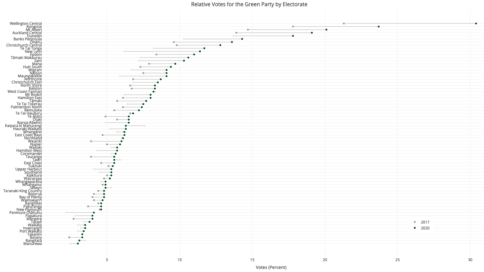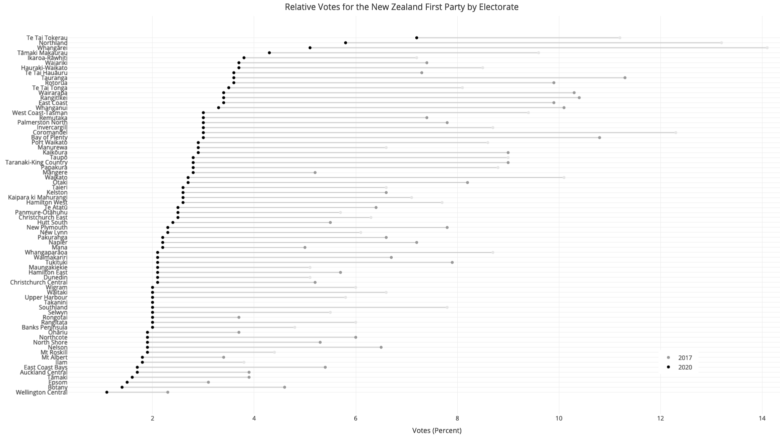 We just had an election in New Zealand. Yay! I was going to sit this one out and enjoy everyone else’s analysis, but there wasn’t as much as I expected - especially good maps. Luckily I spent some time visualising the 2017 election and the code was relatively straightforward to adapt.